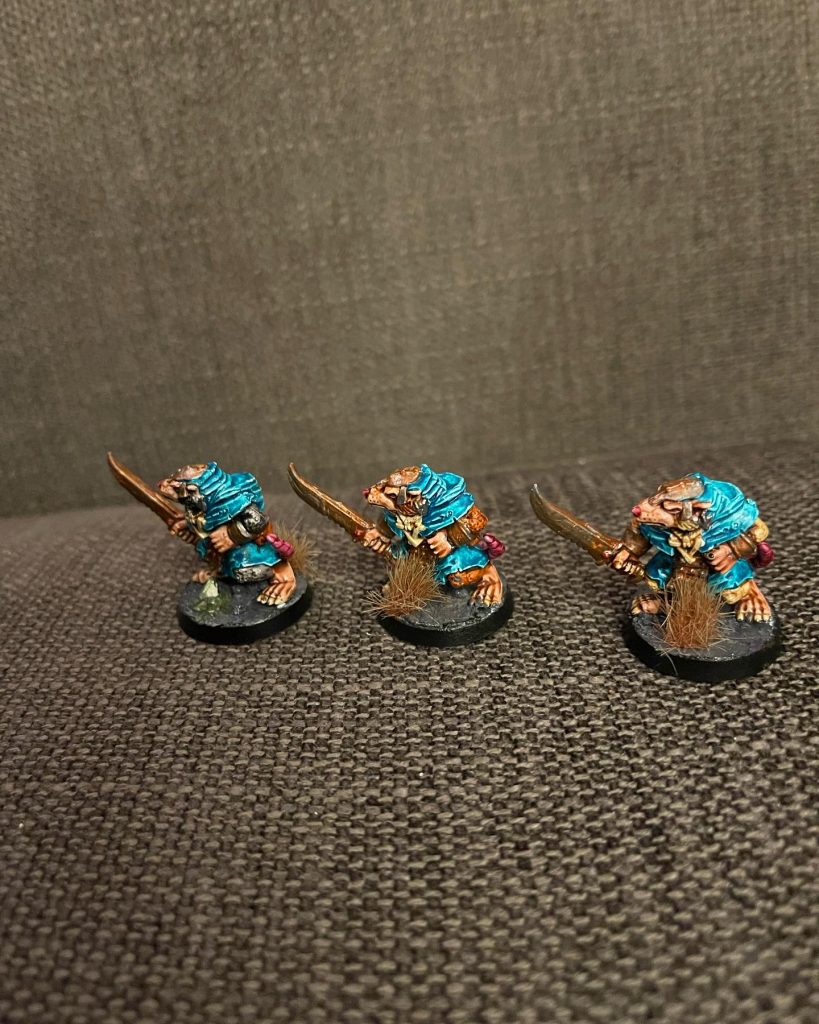 Så er tre mere af mine gamle monopose skaven clanrats malet, og jeg har brugt lidt andre teknikker end på de tidligere, så selvom det er samme farvetoner (på nær halerne da min pink contrast maling er noget anderledes) ser de alligevel markant anderledes – og bedre vil jeg sige – ud. Der er meget mere liv i både hud og især tøjet, men ved nu ikke om jeg gider genmale de første når tonerne nu trods alt er ens, godt jeg ikke spiller og skal tænke på ensartethed i unit om end det da nager mig lidt at der er så tydelig kvalitetsforskel.