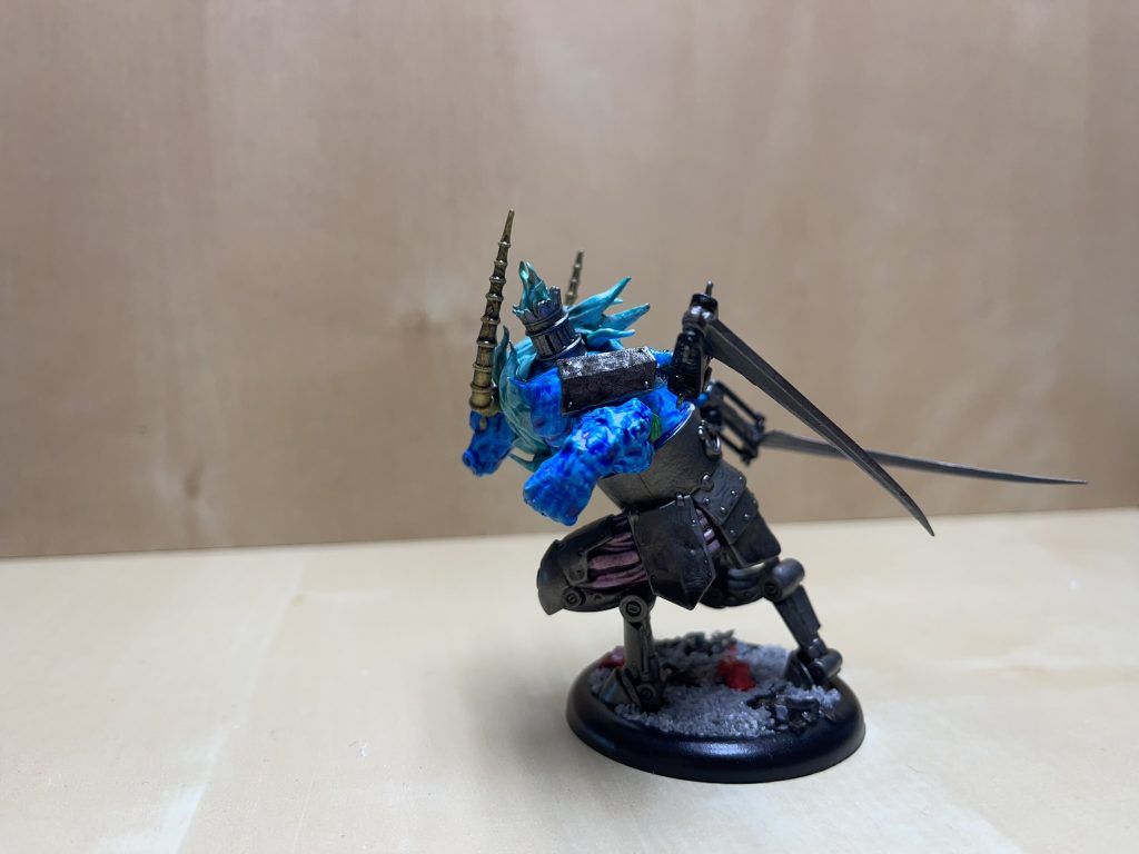 Jeg blev stuck nogle dage igen ved kablerne på dens ben. da jeg først malede dem individuelt i uigennemsigtige farver skiftende mellem flere ligesom vi er vant til fra el og elektronik, men det så bare ikke helt godt ud selvom tanken var fin, så de blev også baset hvid og så fik de en gang lilla contrast for at blive i de kølige toner for at det skulle passe med det magiske for Acanist faktionen.