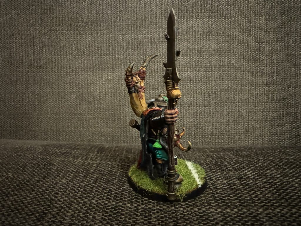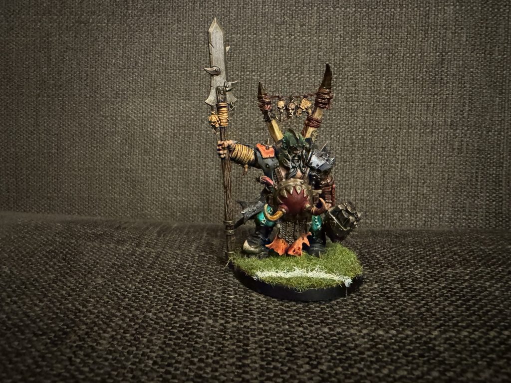 Jeg så den ny Ogre lord i blister da den var “frisk”, og jeg købte den fordi jeg nu engang har et blødt sted for de store gutter. De ogres jeg har liggende er dog fra Fantasy Battle, så med firkantede baser, og ham her havde rundt så mere Age of Sigmar. Han ville dog samtidig fungerer fint som en træner for mit Blood Bowl hold, Fire Mountain Icemaws, så jeg endte med at give ham en passende base dertil. Således blev Crukbos Ironsplinter til – må han føre dem til sejre skulle de nogensinde finde vej til banen ved et uheld*.